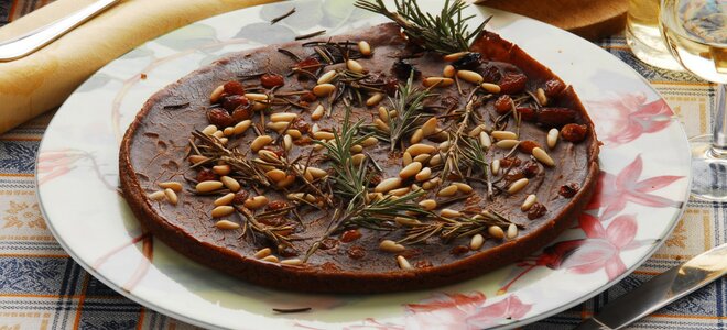 È un dolce autunnale “povero” dalla consistenza corposa e dal gusto molto particolare: ottenuto con farina di castagne, acqua, olio extravergine d’oliva, una manciata di uva passa, pinoli e aghi di rosmarino cosparsi sulla superficie – che rilasciano nell’impasto il loro penetrante profumo – viene cotto in forno fino a diventare di un bel colore marrone scuro, con la parte superiore leggermente “screpolata”. Finite le castagne, lo si preparava anche durante i mesi invernali e in primavera con la farina conservata gelosamente durante tutto l’anno.