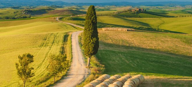 Un panorama ricco e suggestivo: verdi colline tra chilometri e chilometri di vigneti e oliveti, borghi stretti tra ampie mura medievali e strade sinuose.