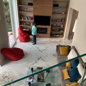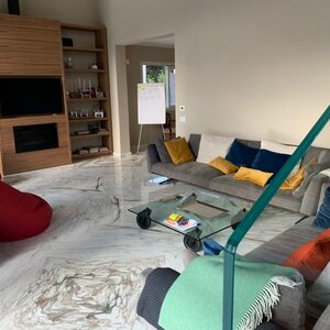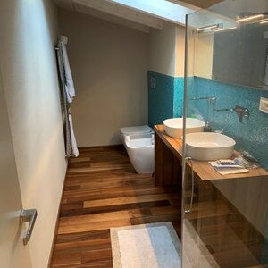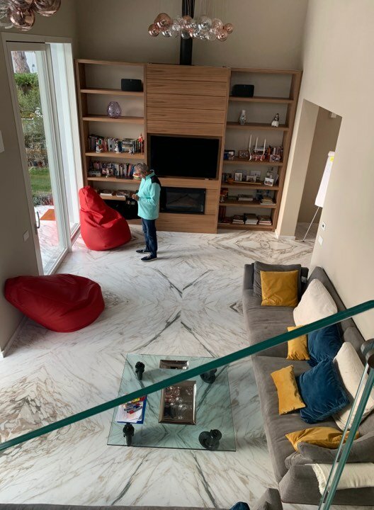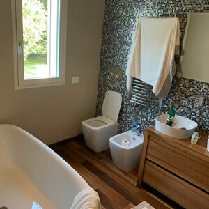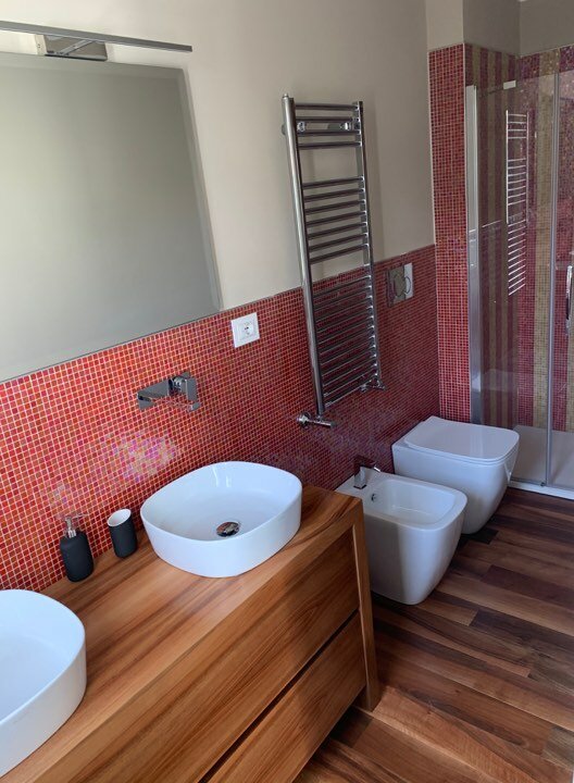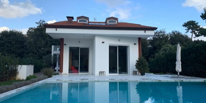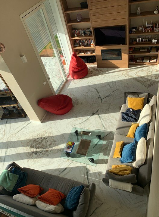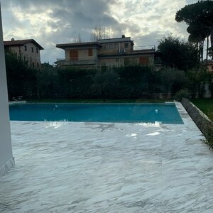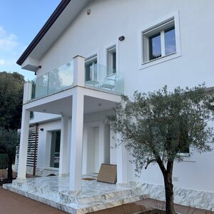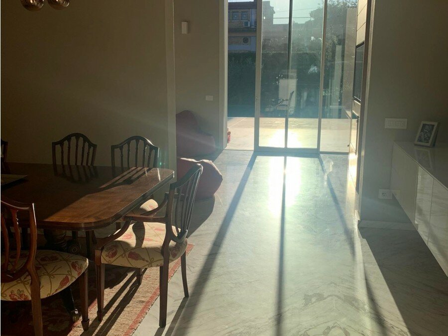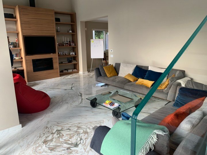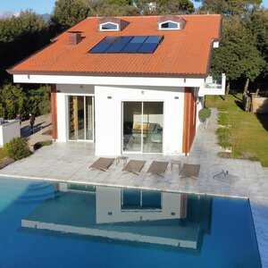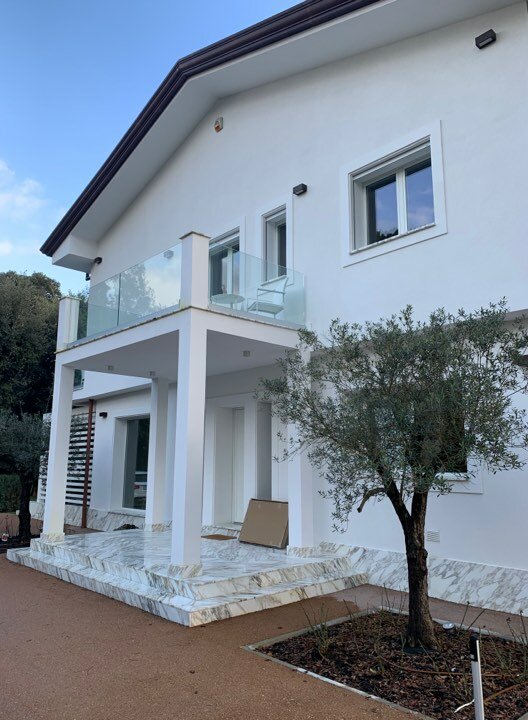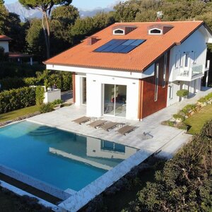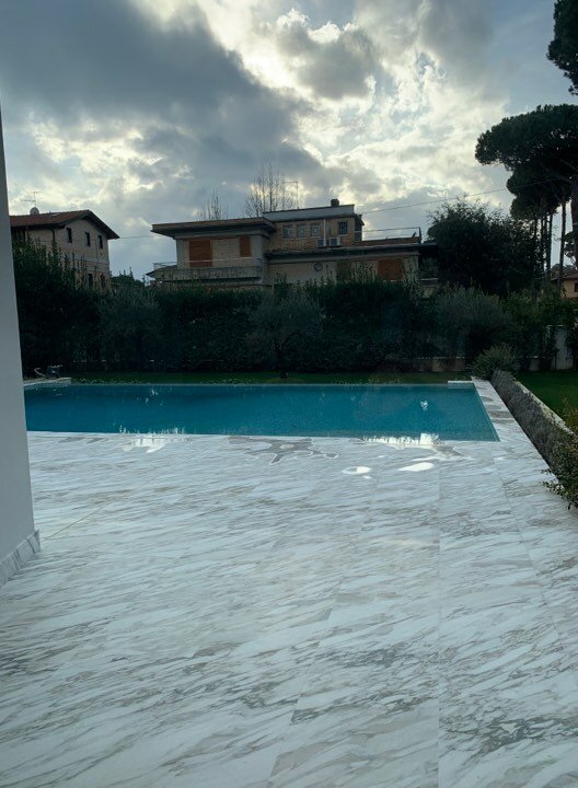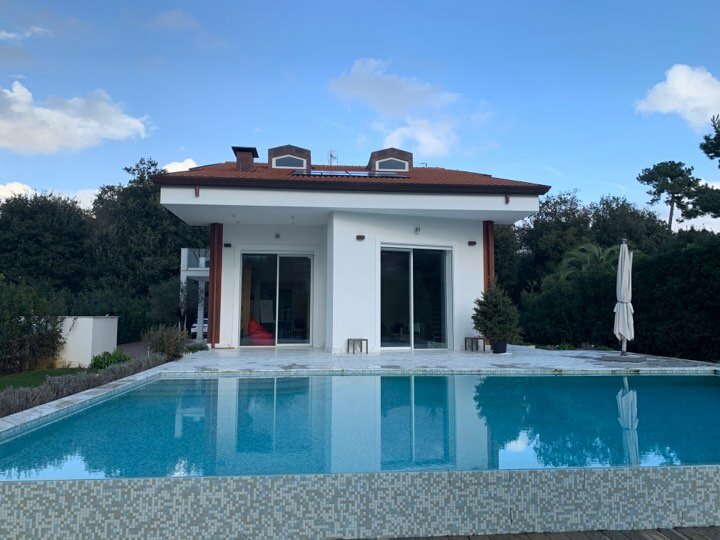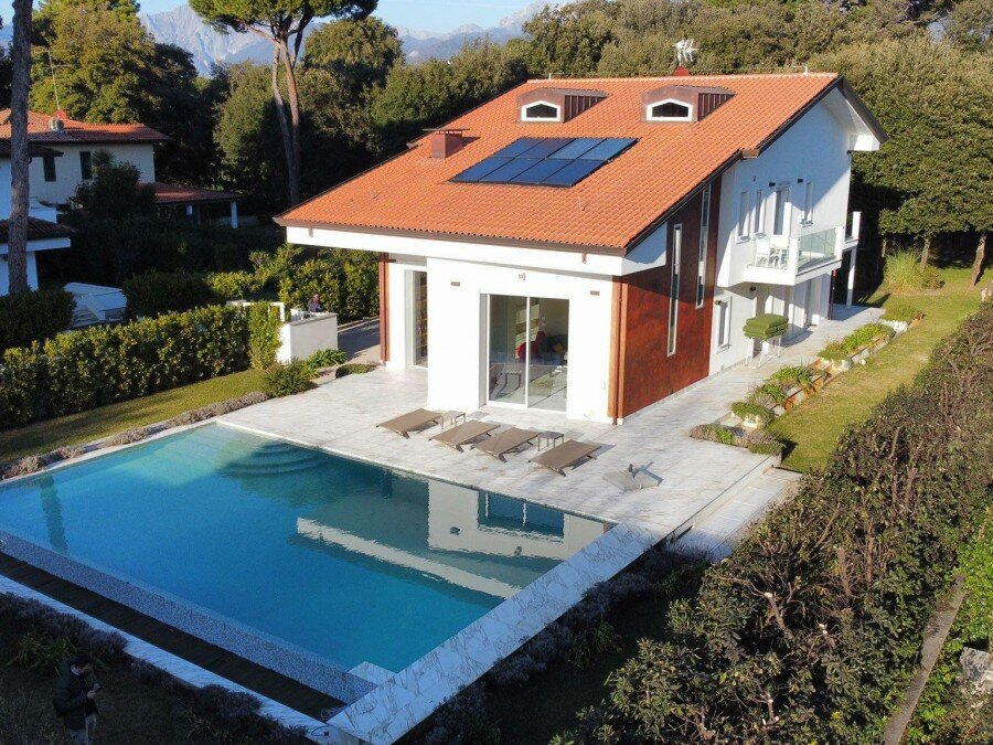 Set in a residential context, with modern and refined furnishings and fine finishes, it consists of: six bedrooms, seven bathrooms, large kitchen island, living room with mezzanine and access to the pool through French windows, meeting room, habitable attic and veranda with marble floor. It also offers parking spaces, air conditioning, wi-fi and alarm.