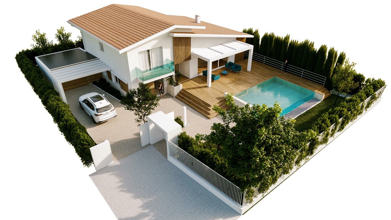 Four bedrooms on two floors, five bathrooms, two balconies, a terrace, a garage and a spectacular swimming pool with a glass wall for the perfect touch of luxury.