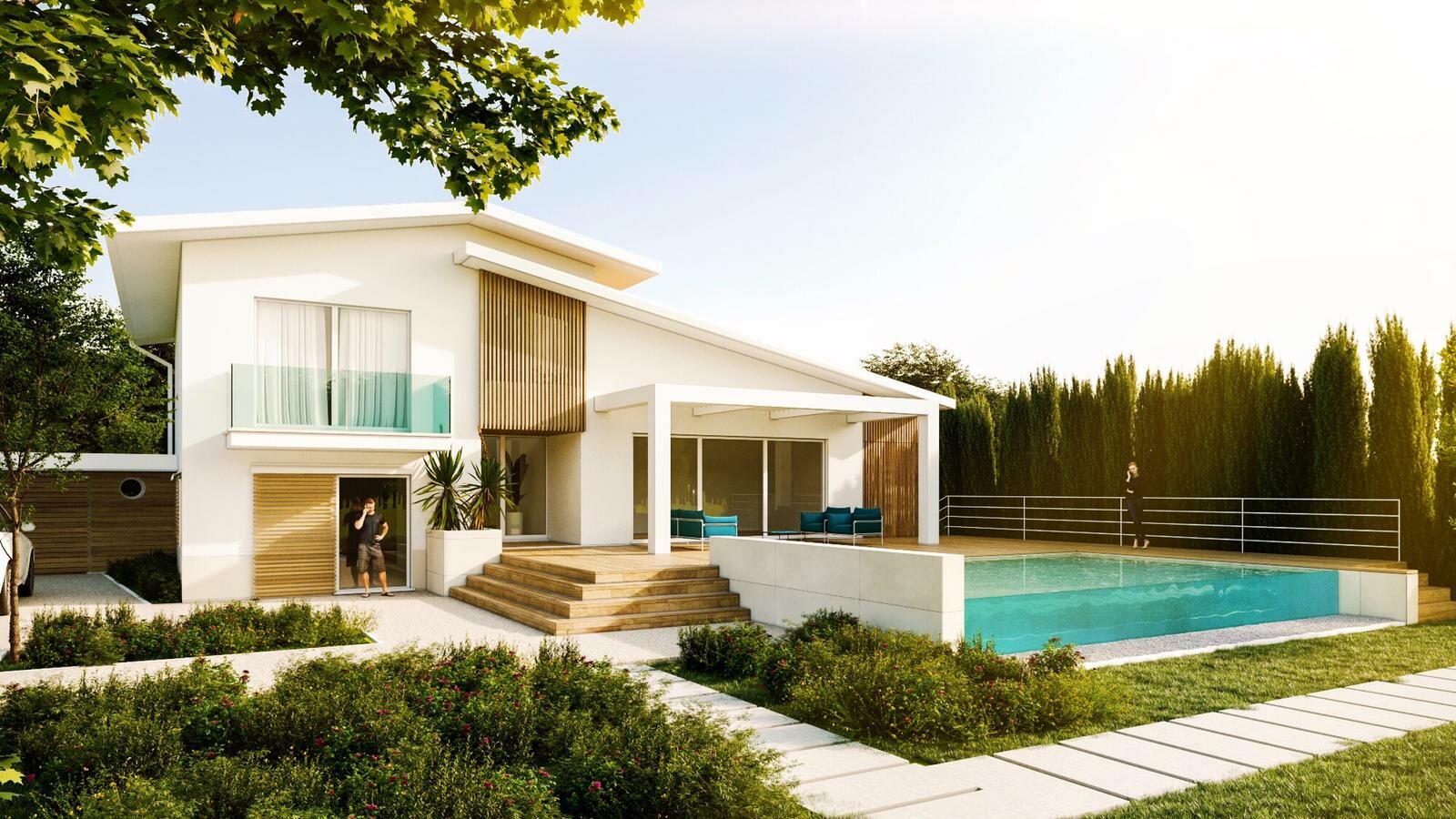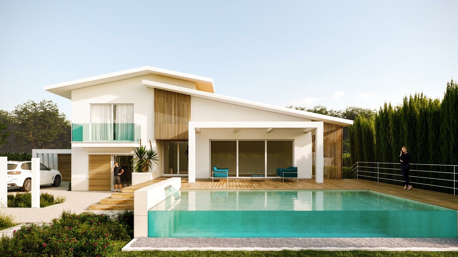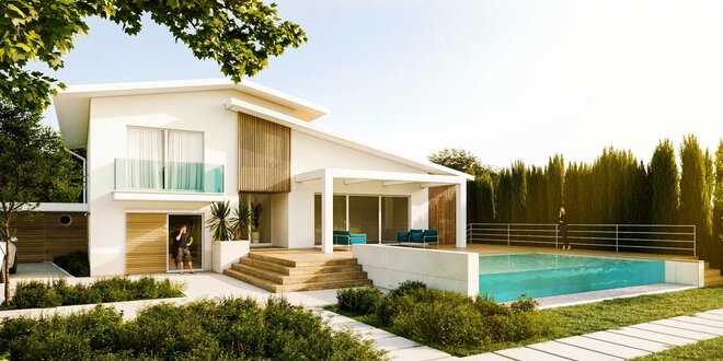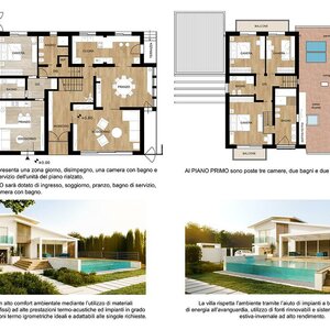 Quattro camere disposte su due piani, cinque bagni, due balconi, terrazza, l'autorimessa e la spettacolare piscina con parete in vetro per un perfetto tocco di lusso.