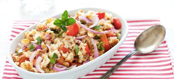 Piatto tipico della cucina toscana e, più in generale, dell'Italia centrale, la panzanella è una preparazione rustica a base di pane raffermo bagnato in acqua e poi strizzato, pomodori, cipolla e basilico, condita con olio, sale e aceto di vino bianco.