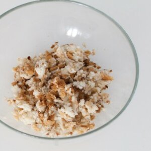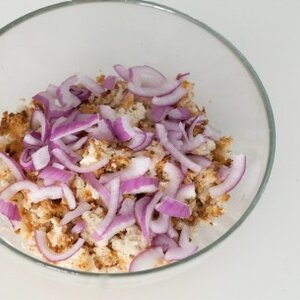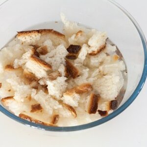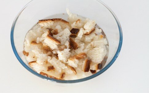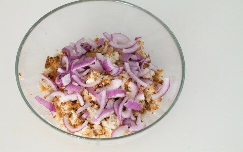 - Spezzettate con le mani il pane raffermo e riunitelo in una ciotola capiente. Aggiungete acqua, quel tanto che basta a bagnarlo. Tagliate la cipolla a fettine e trasferitela in una ciotolina con acqua fredda.