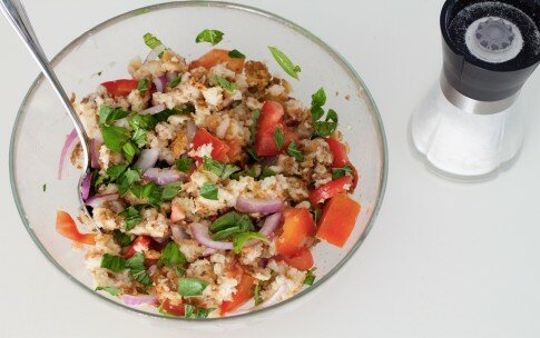 - Unite al contenuto della ciotola il basilico, non lavato ma tamponato con un panno pulito, spezzettato con le mani. Condite la panzanella con abbondante olio di oliva, aceto a piacere e sale. Mescolate e fate riposare almeno un'ora prima di servire.